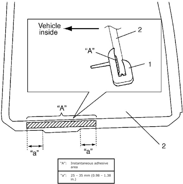 ^ Apply instantaneous adhesive to hatched part "A" between partition glass (2) and partition weather strip (1).