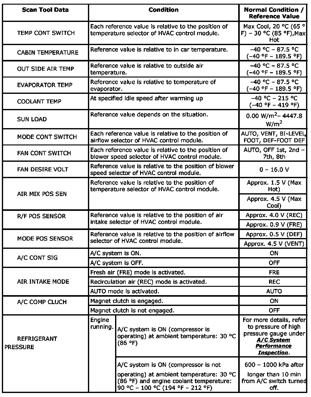 As the data values given below are standard values estimated on the basis of values obtained from the normally operating vehicles by using a scan tool, use them as reference values. Even when the vehicles are in good condition, there may be cases where the checked values do not fall within each specifies data range. Therefore, judgement as abnormal should not be made by checking with these data alone.