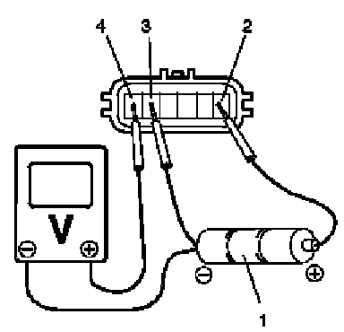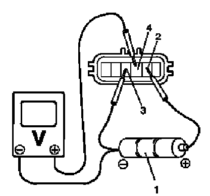 1. For accelerator pedal position (APP) sensor (main), arrange 3 new 1.5 V batteries (1) in series (check that total voltage is 4.7 - 5.0 V) and connect its positive terminal to "Vin 1" terminal (2) and negative terminal to "Ground 1" terminal (3) of sensor. Then using voltmeter, connect positive terminal to "Vout 1" terminal (4) of sensor and negative terminal to battery.