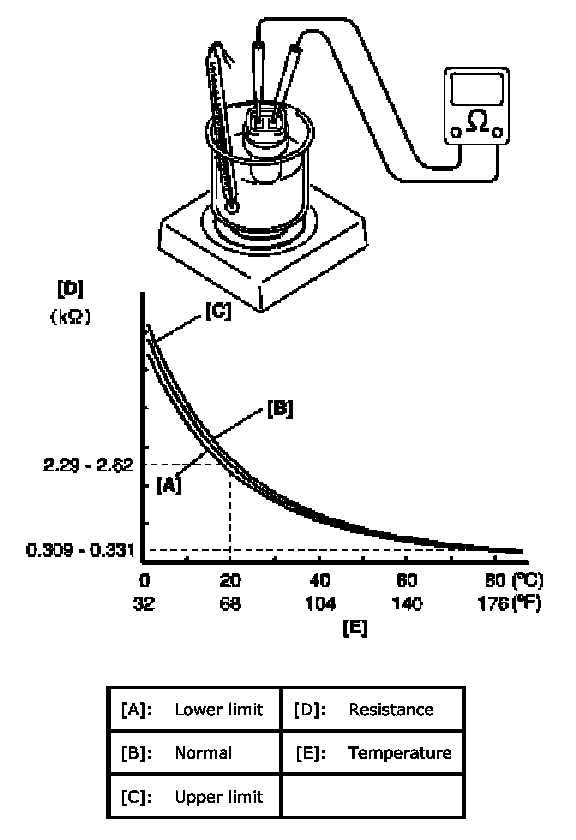 Immerse temperature sensing part of ECT sensor in water and measure resistance between sensor terminals while heating water gradually. If measured resistance doesn't show characteristics as shown in the figure, replace ECT sensor.