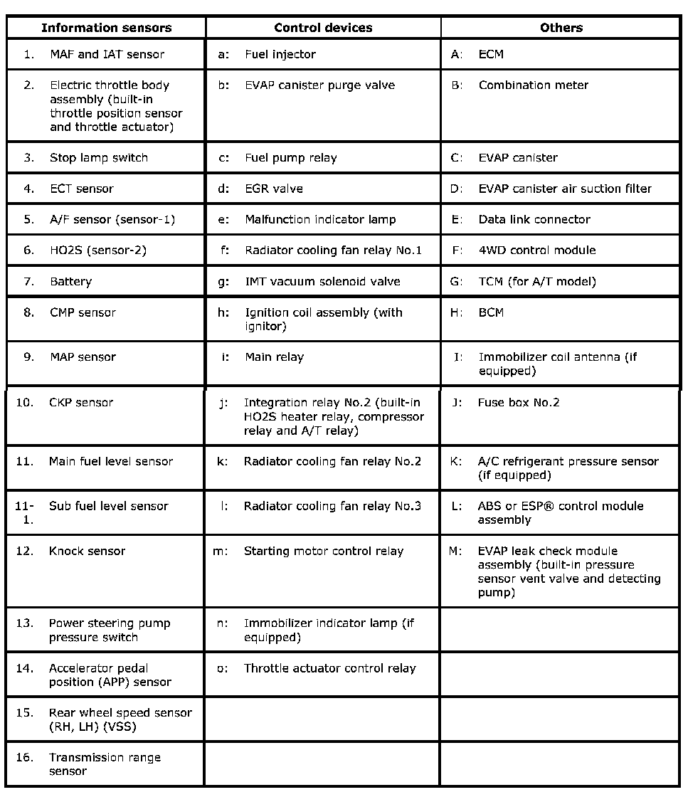 Electronic Control System DescriptionThe electronic control system consists of various sensors which detect the state of engine and driving conditions, ECM which controls various devices according to the signals from the sensors and various controlled devices.