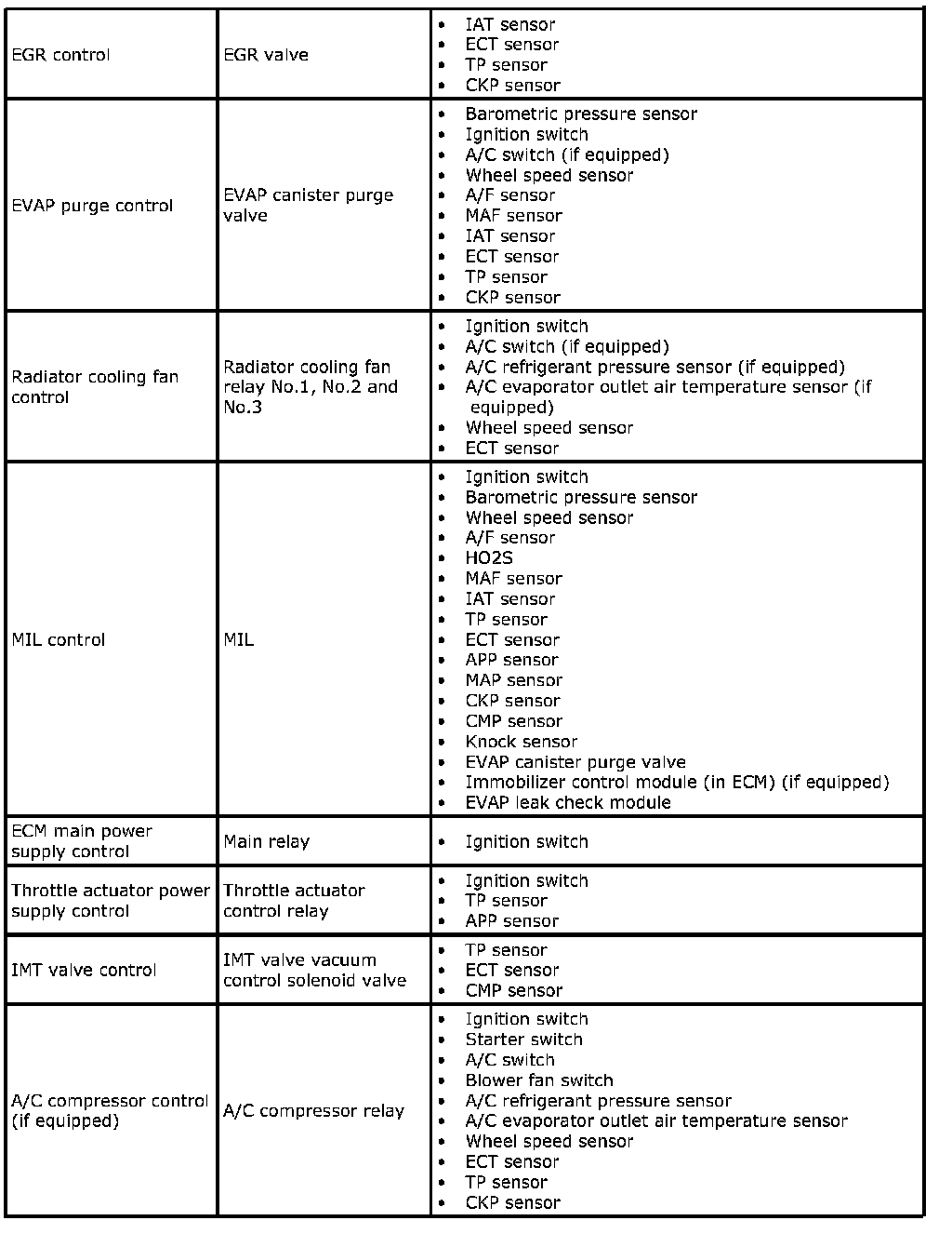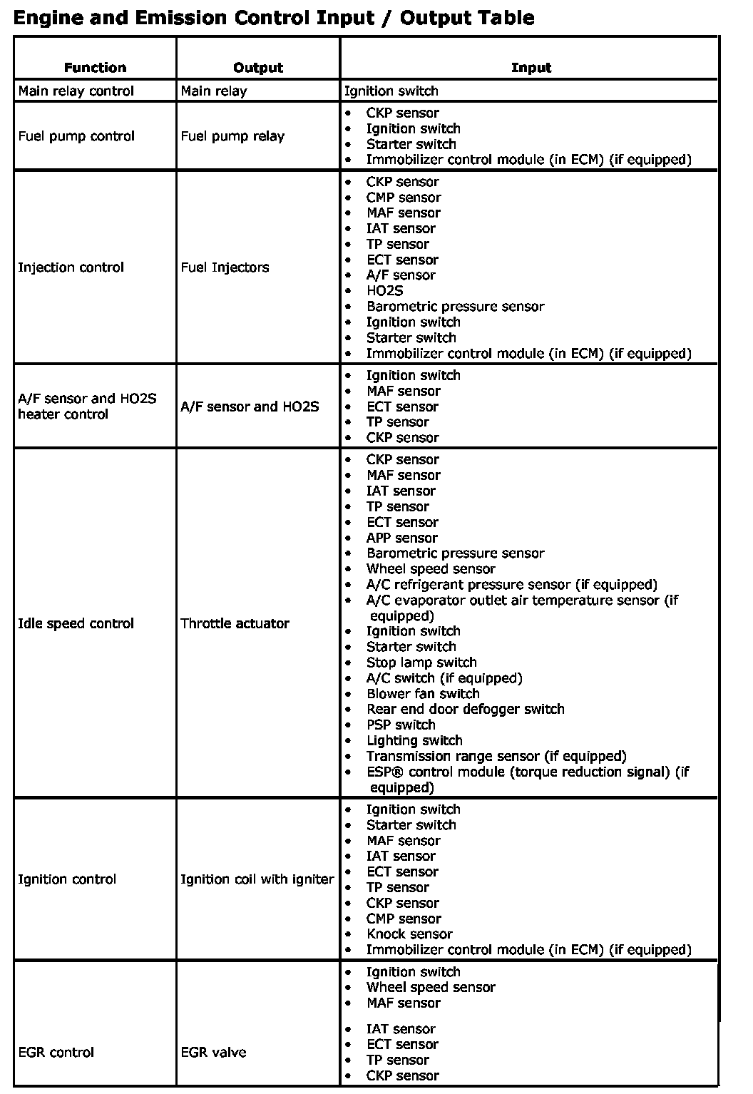 Engine and Emission Control Input / Output Table