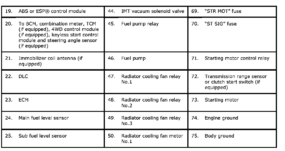 Especially, ECM (Engine Control Module), BCM (Body electrical Control Module), combination meter, TCM (Transmission Control Module (For A/T model)), ABS / ESP(R) control module (if equipped), steering angle sensor (if equipped), 4WD control module (if equipped) and keyless start control module (if equipped) intercommunicate by means of CAN (Controller Area Network) communication.
