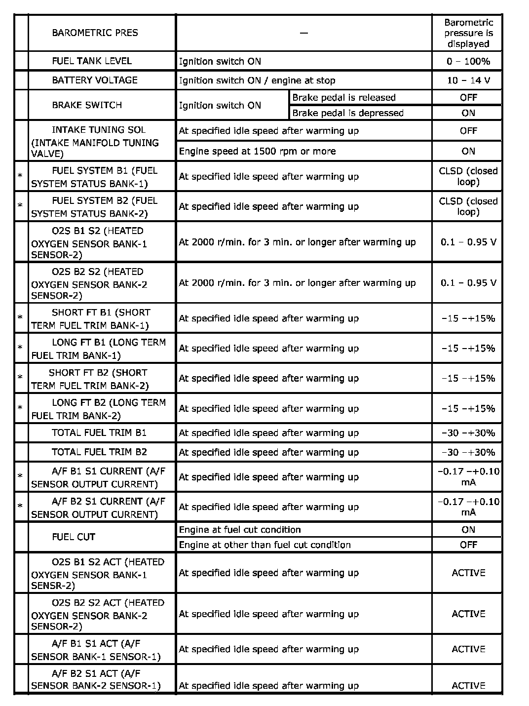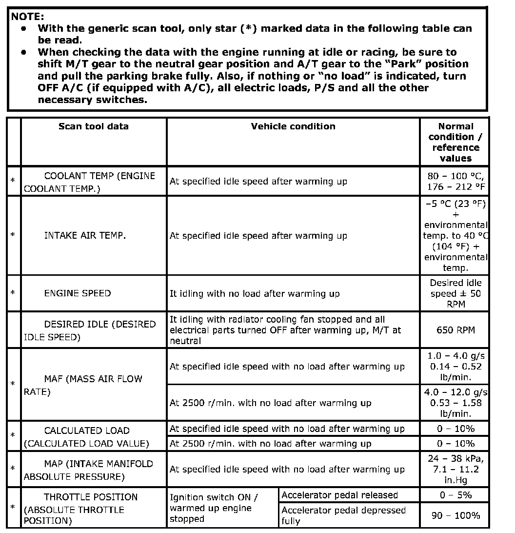 - With the generic scan tool, only star (*) marked data in the table can be read.