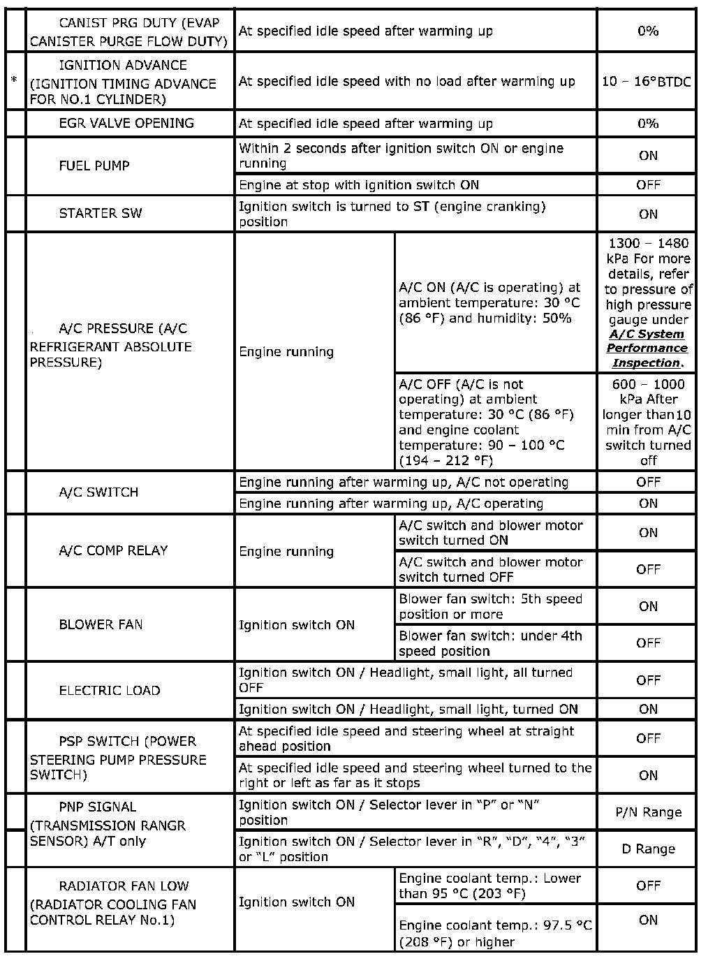 - When checking the data with the engine running at idle or racing, be sure to shift M/T gear to the neutral gear position and A/T gear to the "Park" position and pull the parking brake fully. Also, if nothing or "no load" is indicated, turn OFF A/C (if equipped with A/C), all electric loads, P/S and all the other necessary switches.