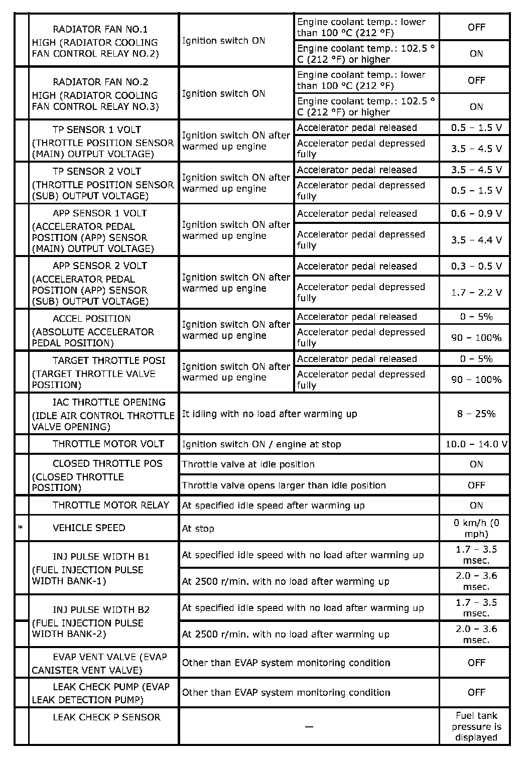 Scan Tool DataAs the data values are standard values estimated on the basis of values obtained from the normally operating vehicles by using a scan tool, use them as reference values. Even when the vehicle is in good condition, there may be cases where the checked value does not fall within
