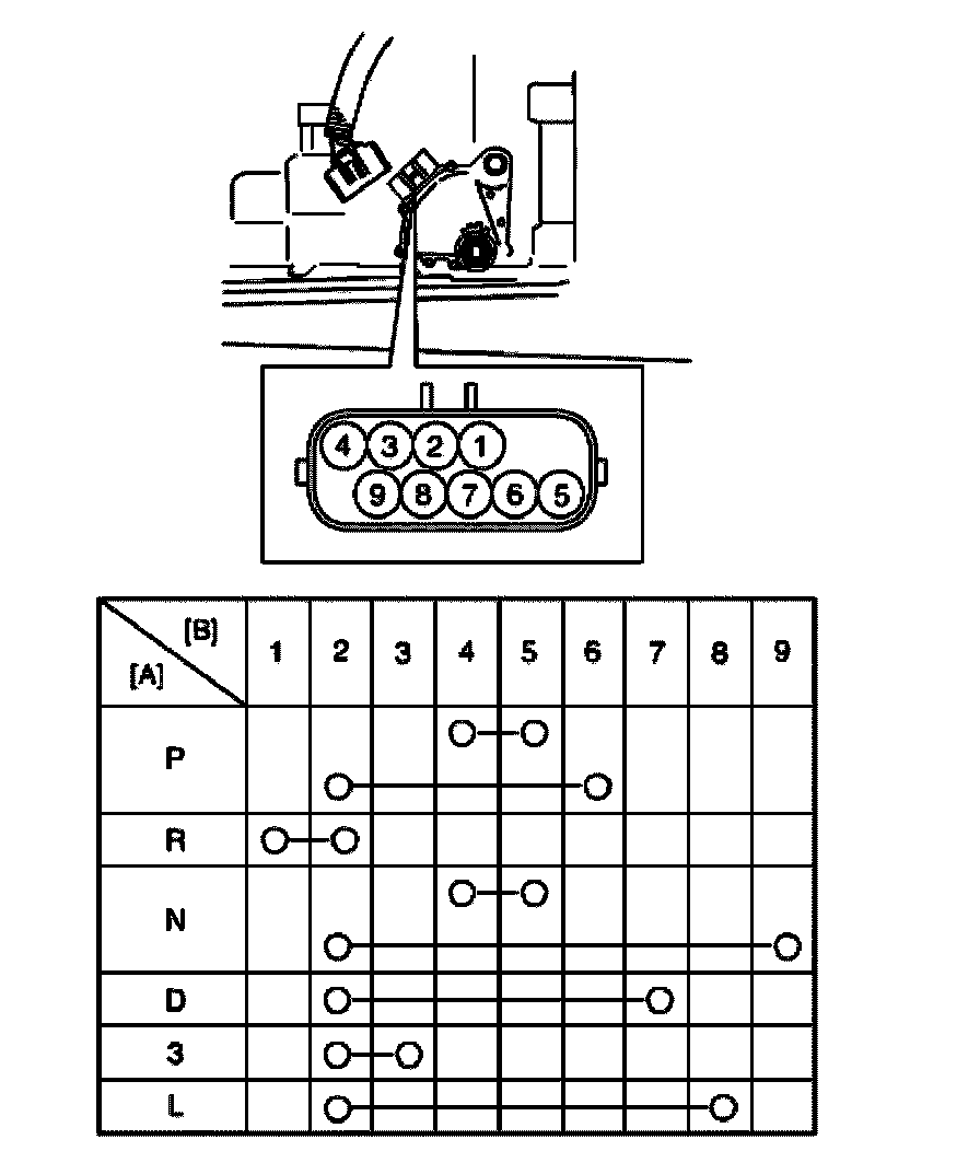 If faulty condition cannot be corrected by adjustment, disconnect transmission range sensor connector and check that continuity exists as shown by moving select lever.
