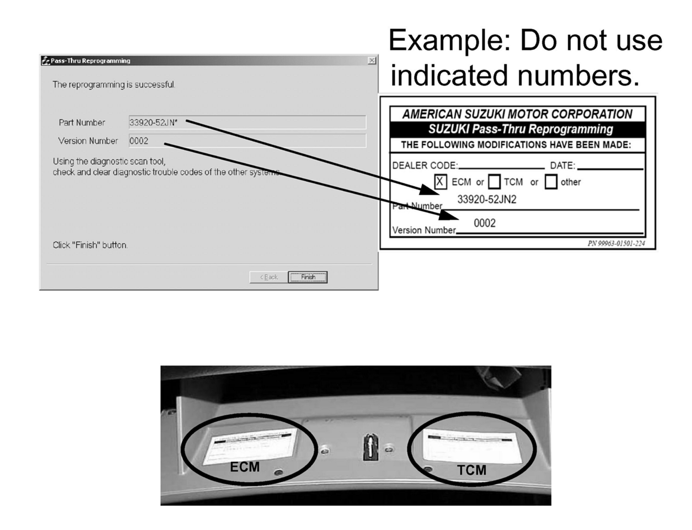 5. Following the procedures outlined in the Suzuki Pass-Thru Reprogramming Tool Operator's Manual, hook up the SDS Interface Tool PIN 09910-06520 or 09910-06521 to the vehicle and run the TCM reprogramming software. If the message "[4028] ECU already has the latest version" appears, click "OK" and "Finish" and then continue to step 6.