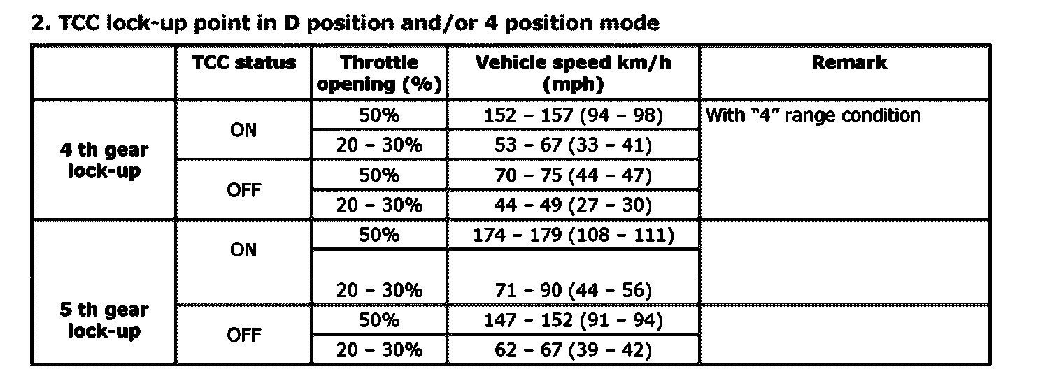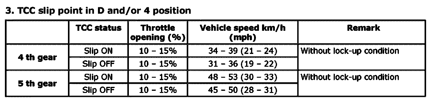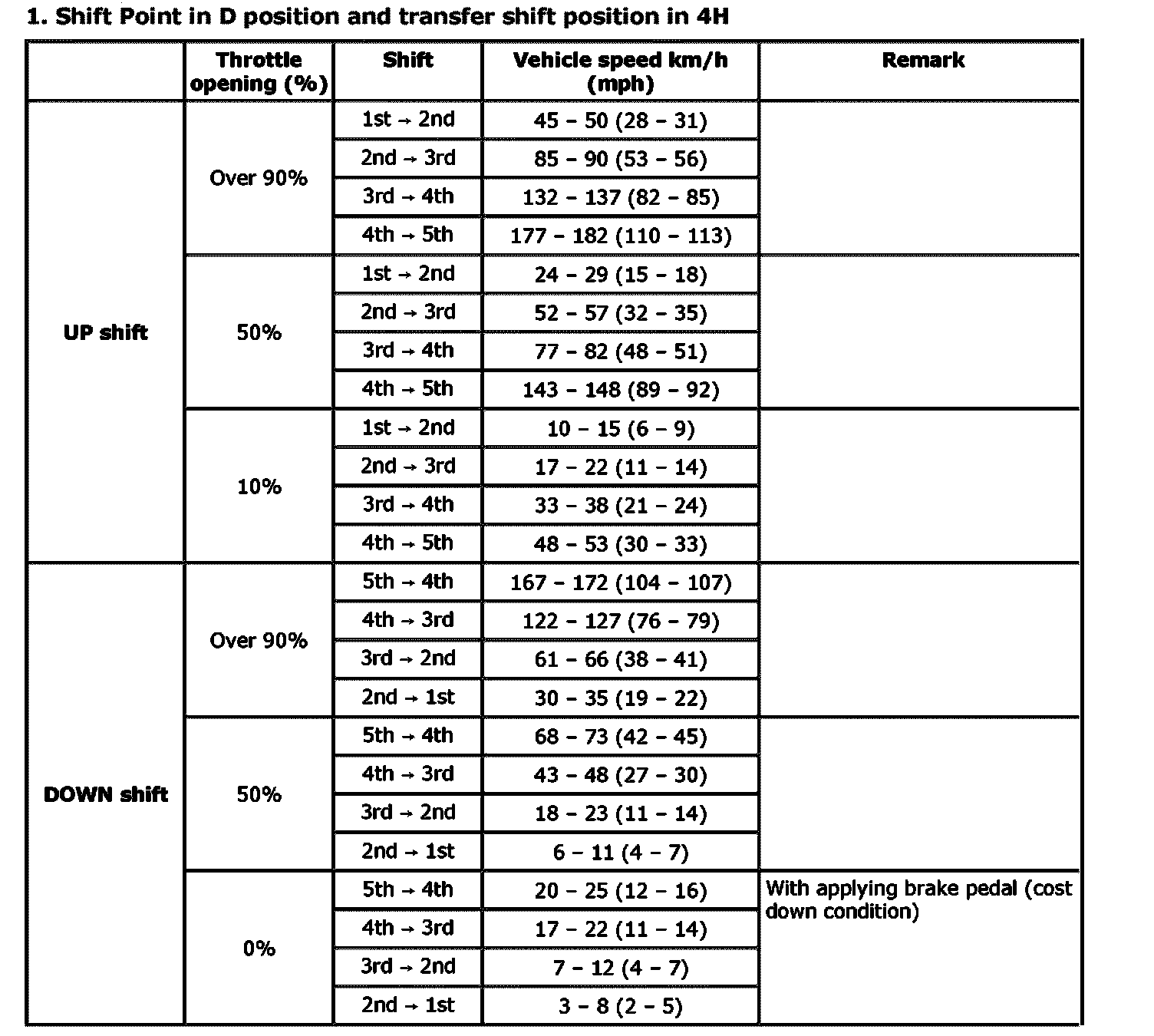 Automatic Gear Shift TableAutomatic gear shift schedule is shown in the following table. Test-drive the vehicle on a flat road in the D position.