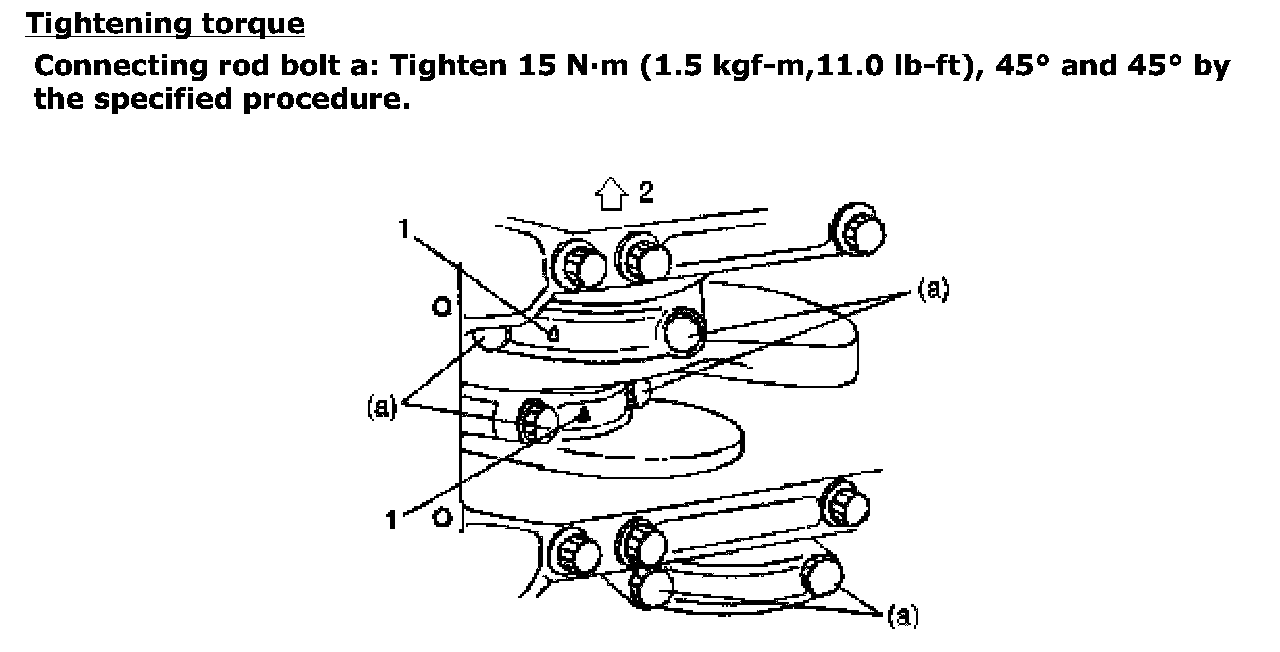 a: Tighten 30 Nm (3.0 kgf-m, 22.0 ft. lbs.), 0 Nm (0 kgf-m, 0 ft. lbs.), 42 Nm (4.2 kgf-m, 30.5 ft. lbs.) and 40° by the specified procedure