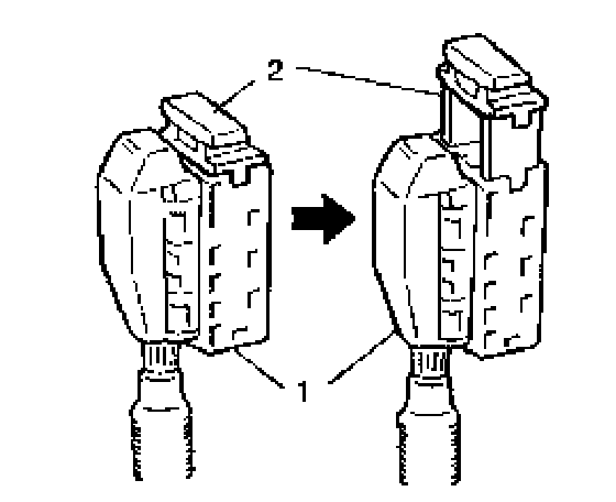 2) Disconnect ABS hydraulic unit/control module assembly connector (1) by pulling up lock (2).