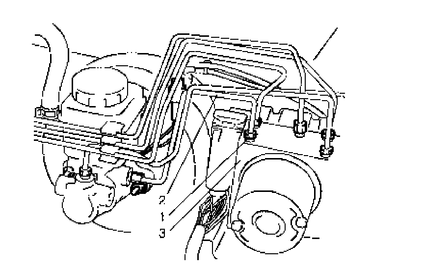 3) Using special tool (flare nut wrench), loosen flare nuts (1) and disconnect brake pipes (2) from ABS hydraulic unit/control module assembly (3).