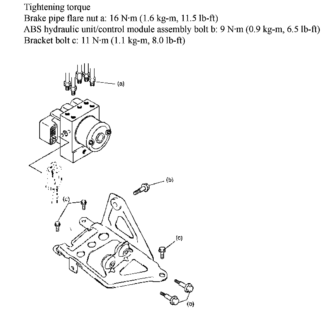 ABS hydraulic unit/control module assembly bolt b: 9 Nm (0.9 kg-m, 6.5 ft. lbs.)