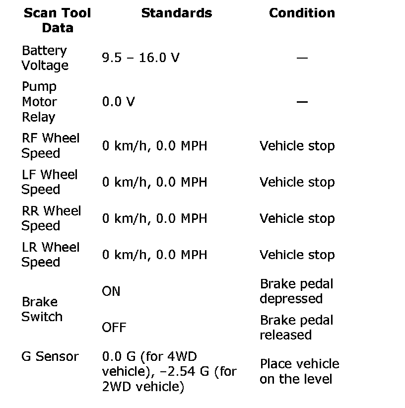 Scan Tool DataThe parameter data below are values measured with the scan tool when the normally operating vehicle is under the following conditions. When taking measurements for comparison by using the scan tool, be sure to check that the vehicle is under the following conditions.