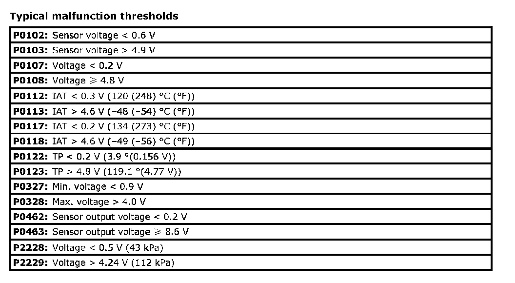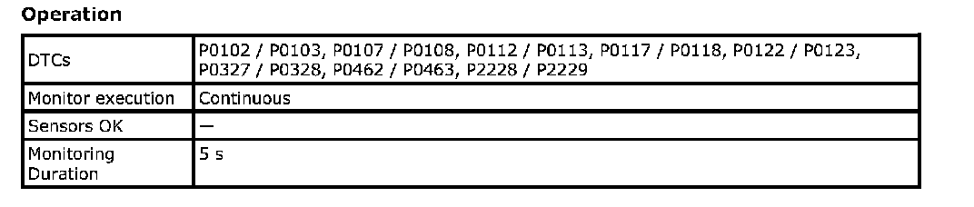 Input signals of MAF (P0102 / P0103), MAP (P0107 / P0108), IAT (P0112 / P0113), ECT (P0117 /P0118), TP (P0122 / P0123), Knock sensor (P0327 / P0328), Fuel level sensor (P0462 / P0463) and Barometric pressure sensor (P2228 / P2229) are checked for open, short of circuit by monitoring input voltage.