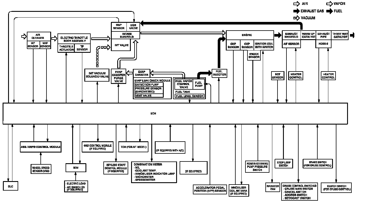 Electronic Control System DescriptionThe electronic control system consists of various sensors which detect the state of engine and driving conditions, ECM which controls various devices according to the signals from the sensors and various controlled devices.