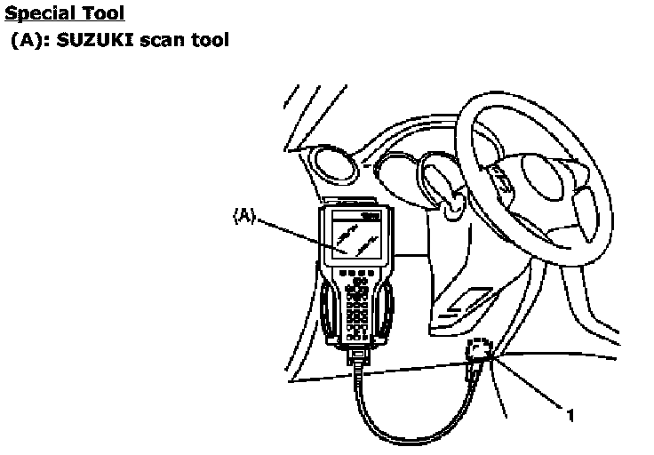 VIN Registration1. Connect SUZUKI scan tool to data link connector (DLC) (1) located on under side of instrument panel at drive's seat side.