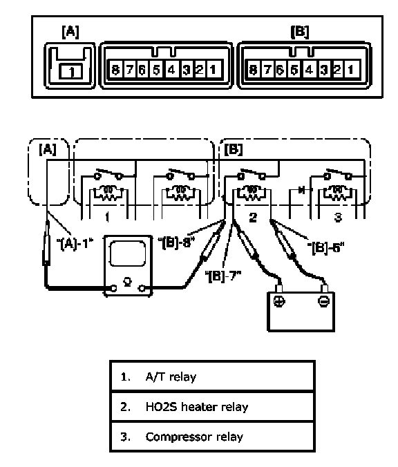 3. Check that there is no continuity between terminals "[A]-1" and "[B]-8" of relay.