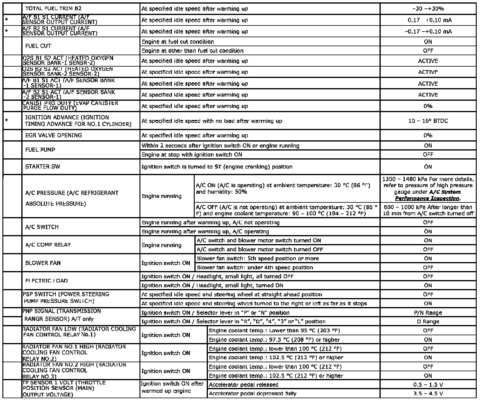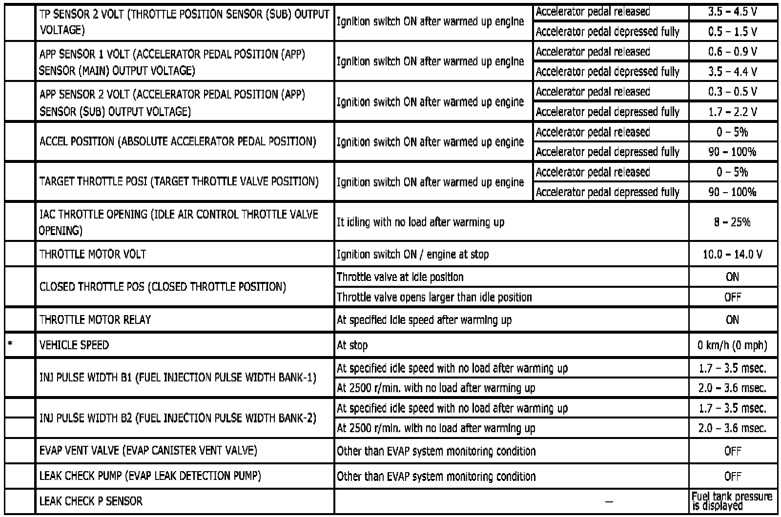 Scan Tool DataAs the data values are standard values estimated on the basis of values obtained from the normally operating vehicles by using a scan tool, use them as reference values. Even when the vehicle is in good condition, there may be cases where the checked value does not fall within each specified data range. Therefore, judgment as abnormal should not be made by checking with these data alone.