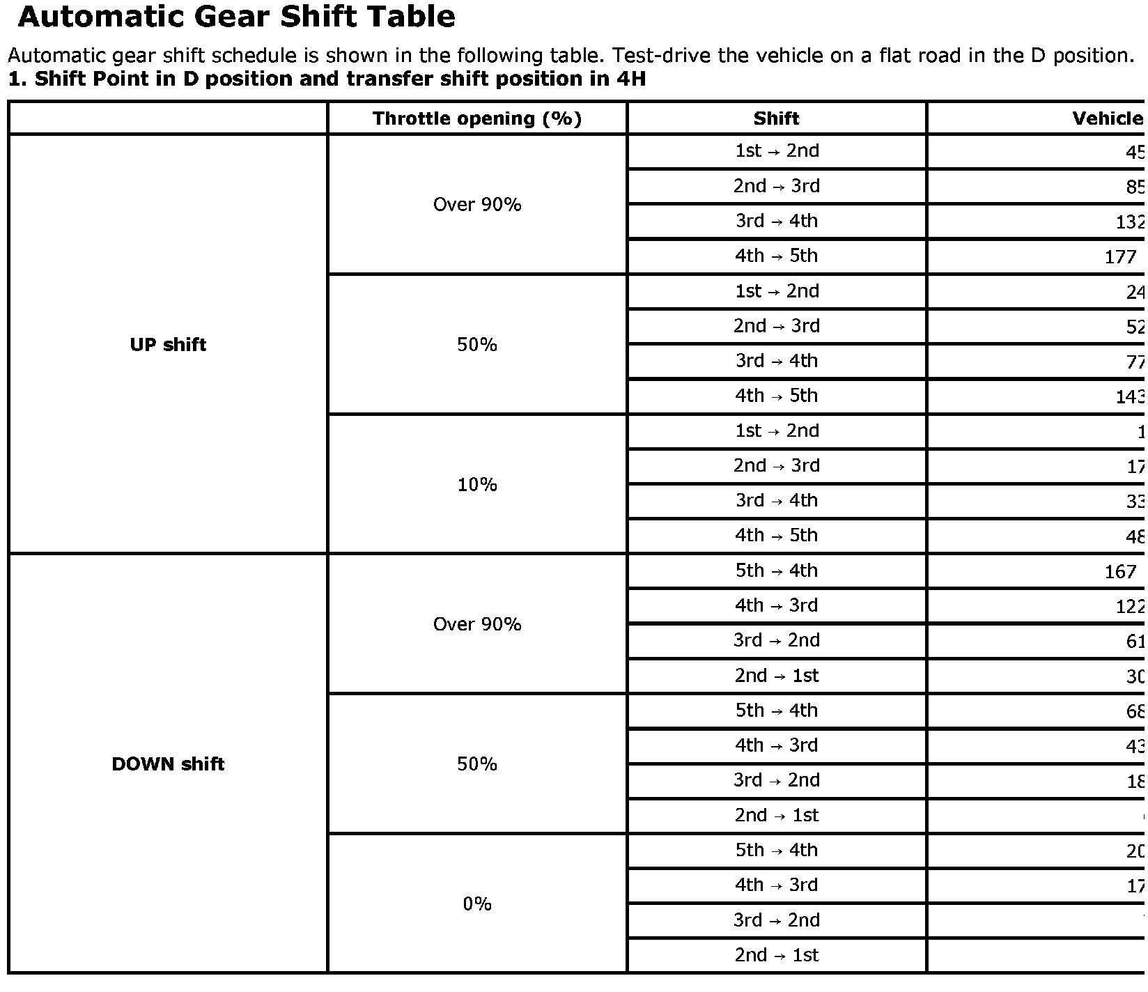 Automatic Gear Shift TableAutomatic gear shift schedule is shown in the following table. Test-drive the vehicle on a flat road in the D position.