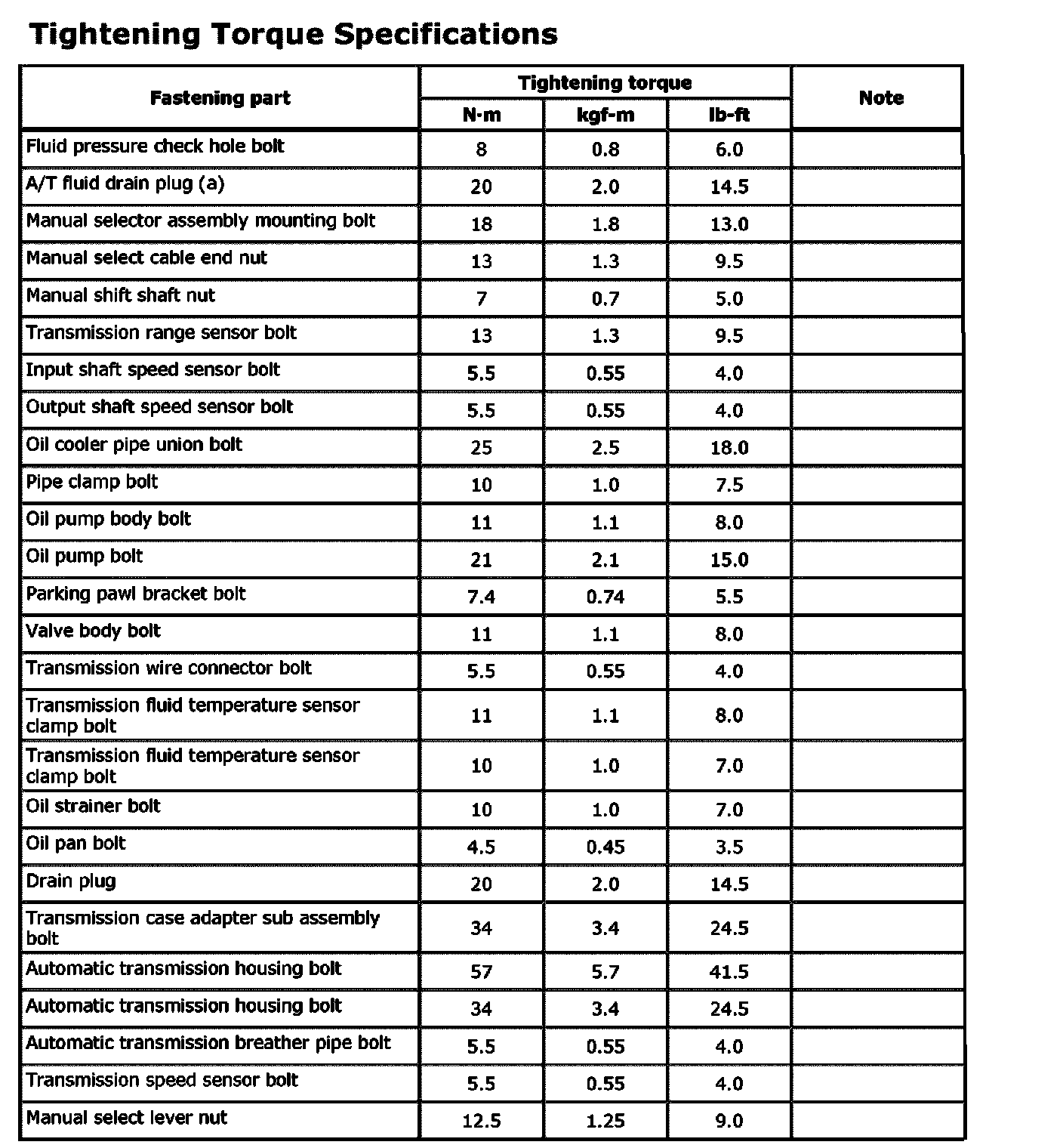 Tightening Torque Specifications