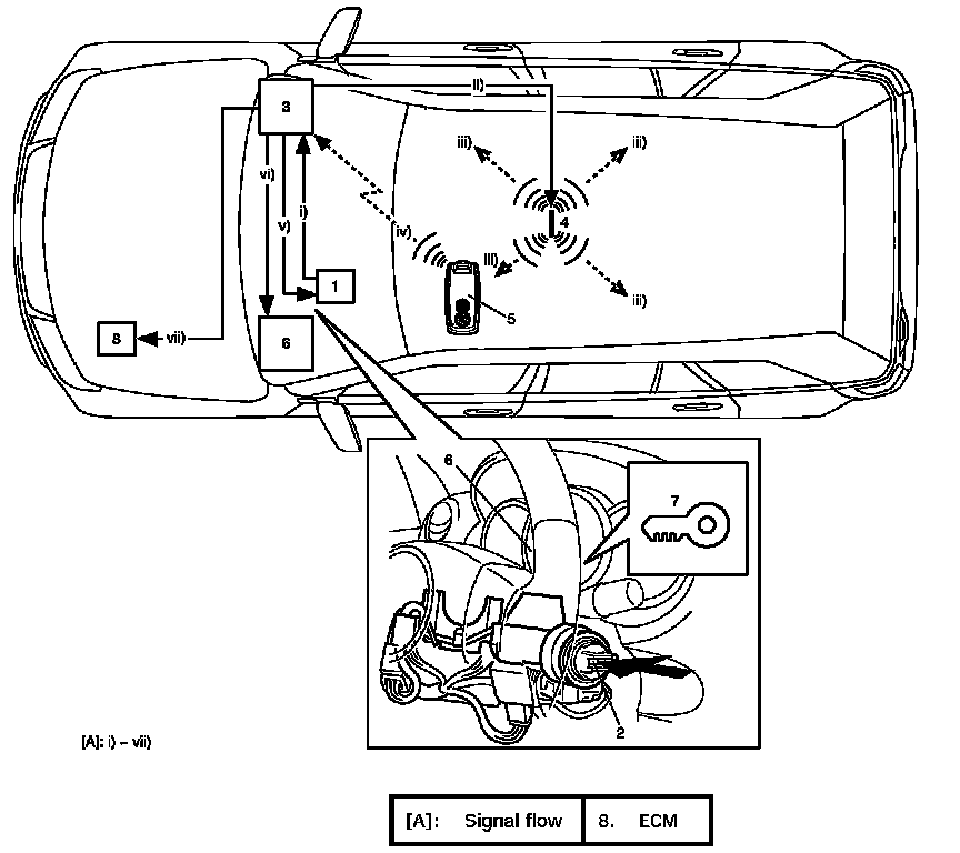Keyless Engine Start FunctionWhen the ignition knob switch (2) installed to the steering lock unit (1) is pushed, the keyless start control module (3) activates the center antenna (4) to send out the request signal in the vehicle compartment. When the remote controller (5) receives the request signal from the center antenna, it transmits the ID code to the keyless start control module. The keyless start control module compares the ID code sent by the remote controller with the ID code registered in the keyless start control module. When these ID codes match, the keyless start control module makes the key indicator light (7) in the combination meter (6) light in blue and unlocks the steering lock unit to enable the ignition knob switch to turn. When the ignition knob switch is turned to ON position in this state, ID codes of ECM and keyless start control module are compared through CAN communication (immobilizer function). When they match, turning the ignition knob switch to start position will start the engine.