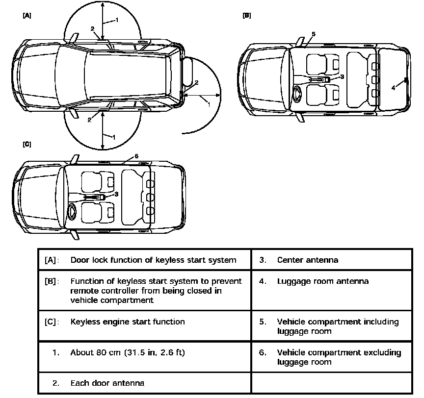 Operation Area of Remote ControllerShown given are the operation areas of the remote controller for the keyless engine start function and door lock function of the keyless start system.
