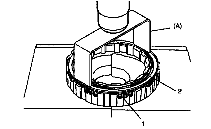 Automatic Transmission Unit Assembly Continued57. Place snap ring (2) on 2nd (No.3) brake piston return spring retainer being sure not to align snap ring end gap with spring retainer claw.