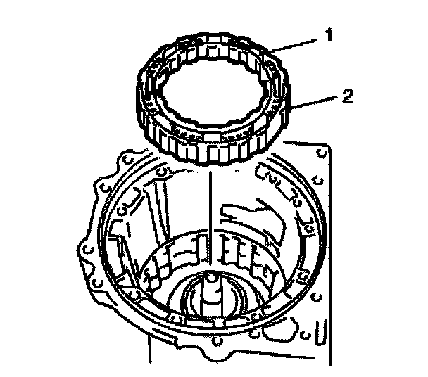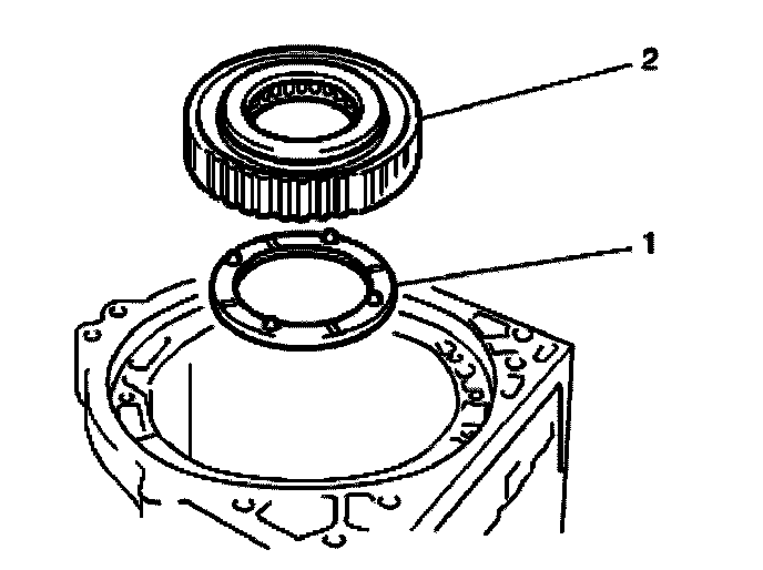 61. Install clutch hub thrust washer (1) and one-way No.2 clutch assembly (2) to transmission case.