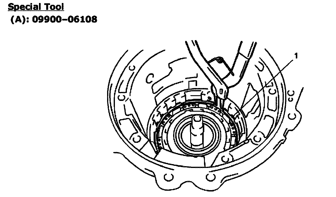 59. Install snap ring (1) by using special tool being sure not to align snap ring end gap with cut portion of transmission case.
