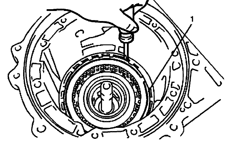 64. Install snap ring (1) by using flat end rod or the like being sure not to align snap ring end gap with cut portion of transmission case.