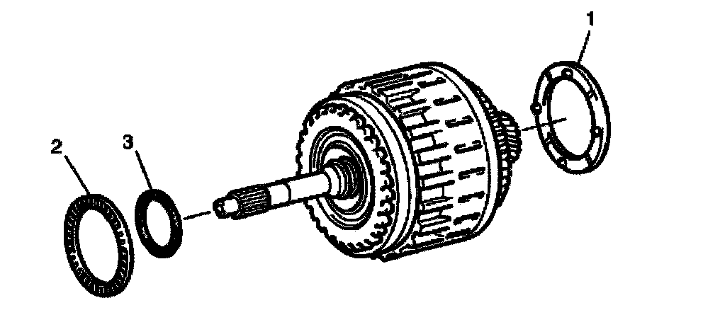 66. Install thrust needle roller bearing No.1 (2) and thrust needle roller bearing No.2 (3) to clutch dram and input shaft assembly.