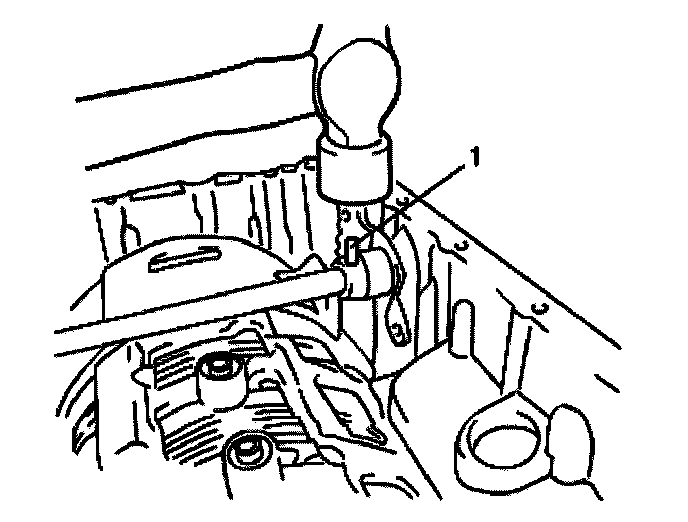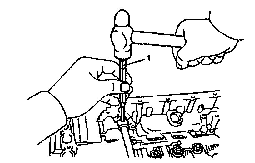 76. Align hole in sleeve cover with dent in manual shift lever and caulk securely with pin punch (1). Then check that manual shift shaft turns smoothly.
