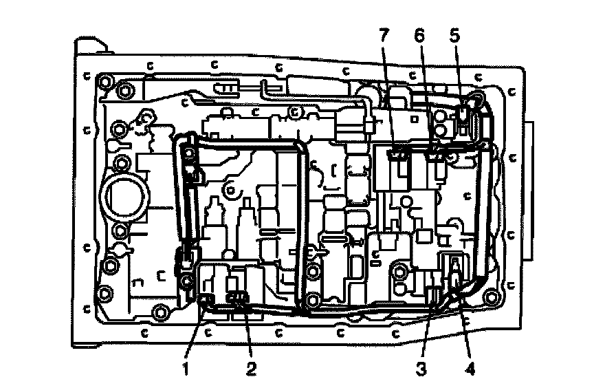 92. Connect pressure control solenoid-A connector (1), pressure control solenoid-B connector (2), shift solenoid-A connector (3), shift solenoid-B connector (4), shift solenoid-E connector (5), TCC solenoid connector (6) and pressure control solenoid-C connector (7) to each solenoid valve.