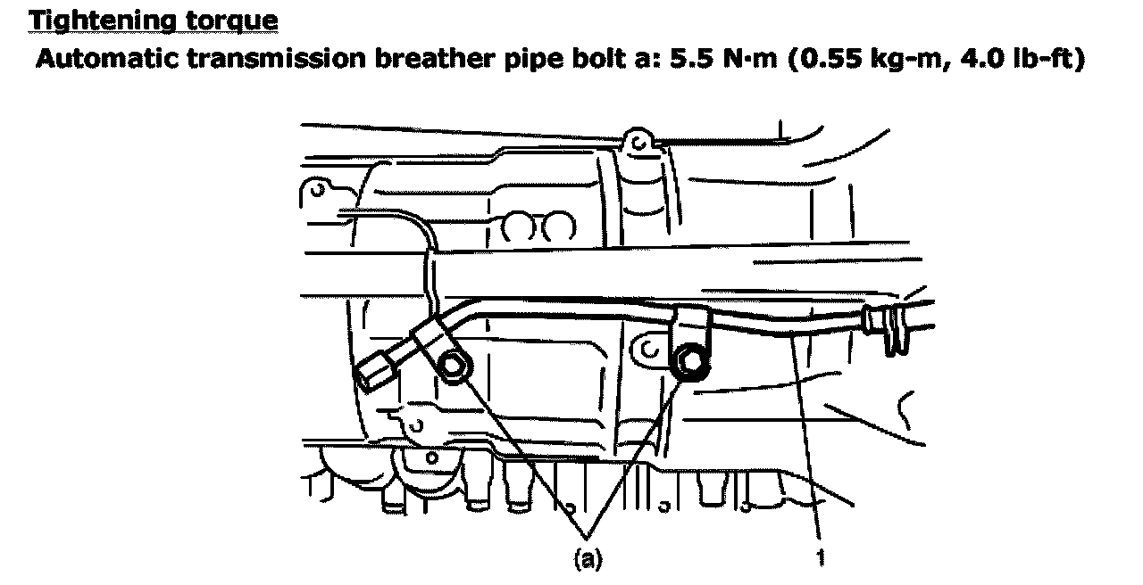 104. Install automatic transmission breather hose. Tightening 2 automatic transmission breather pipe bolts to specified torque.