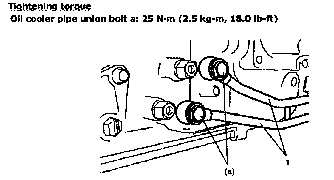107. Apply A/T fluid to new 4 union gaskets and then install oil cooler pipes (1). Tighten 2 oil cooler pipe union bolts to specified torque.
