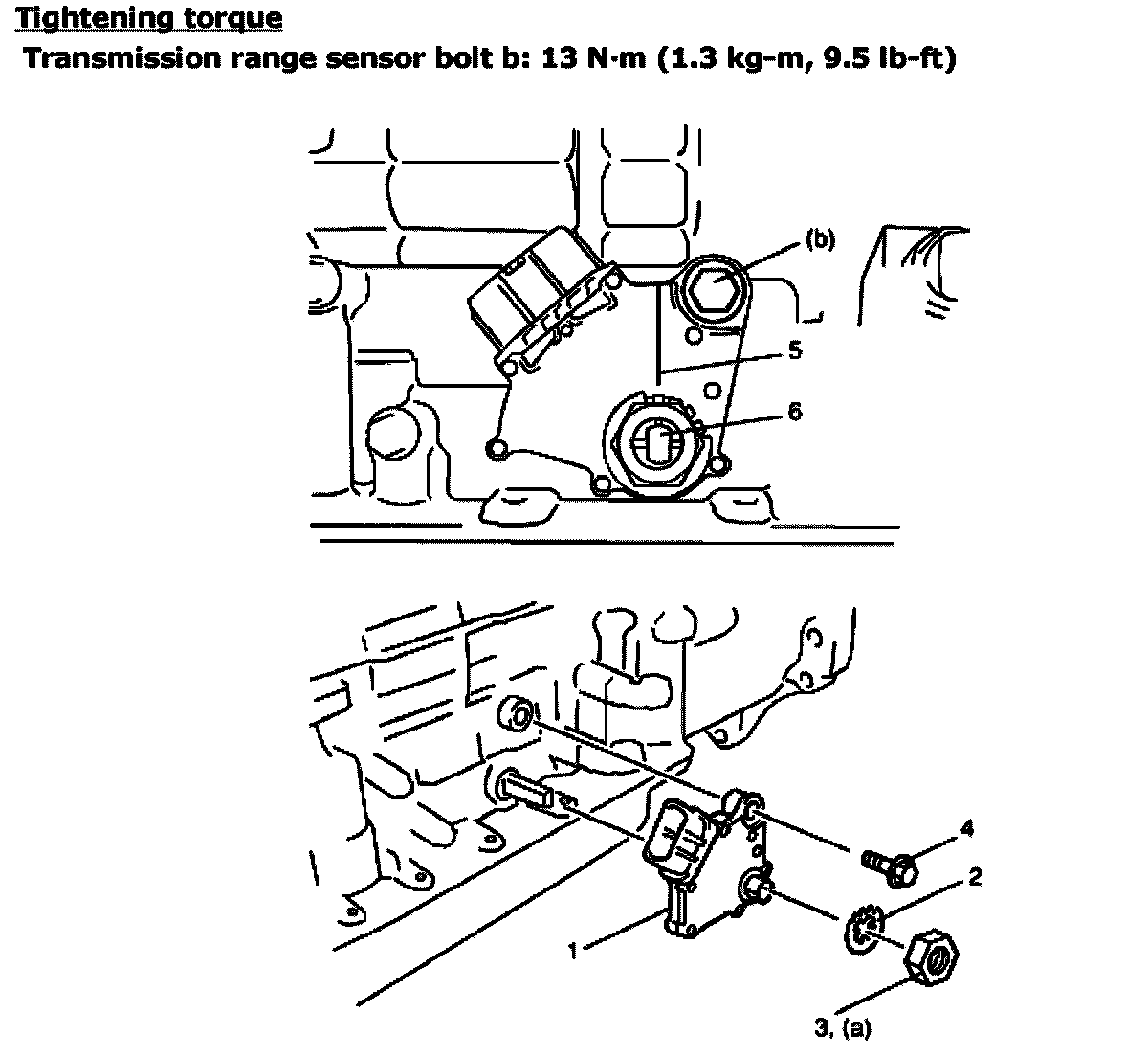 111. With neutral reference line (5) and groove (6) in transmission range sensor aligned. Tighten transmission range sensor bolt (4) to specified torque.