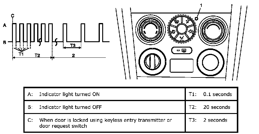 When B, C or D mode is selected and the door is locked using keyless entry transmitter or door request switch, the theft deterrent light (1) flashes at 0.1 second interval for 20 seconds and the security alarm system is set to the stand-by mode (2). Once it is set to the stand-by mode, the theft deterrent light blinks at 2 second intervals.
