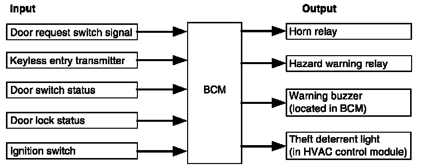 The security alarm system provides a warning of an abnormal condition to those who are around. Its operation is as follows. While the system is in the stand-by mode (when 20 seconds or more elapsed after the door is locked using a keyless entry transmitter or door request switch), BCM monitors door lock status, door switch status and battery power supply voltage. When it detects an abnormal condition (door is unlocked by some way other than using keyless entry transmitter or door request switch and opened or cut off BCM power supply voltage temporarily), it activates the warning buzzer (located in BCM), theft deterrent light, hazard warning relay and horn relay. The security alarm system has 2 or 4 selectable modes depending on BCM specification.