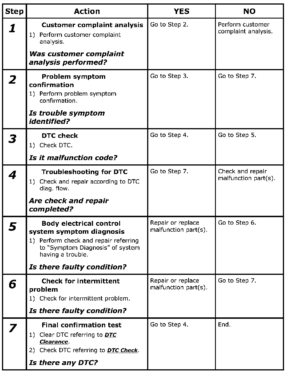 Confirm that the problem symptom has gone and the body electrical control system is free from any abnormal conditions. If what has been repaired is related to the malfunction DTC, check again and confirm that no DTC is indicated.