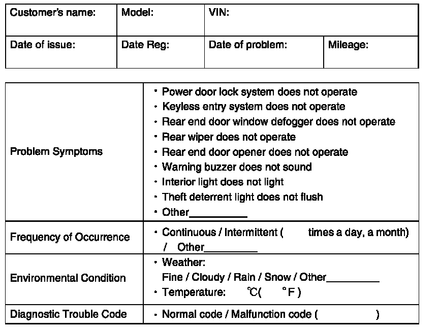 Check DTC stored in BCM memory referring to DTC Check, record it and then clear it referring to DTC Clearance. DTC indicates malfunction that occurred in the system but does not indicate whether it exists now or it occurred in the past and the normal condition has been restored now. To check which case applies, clear DTC once and check whether or not any fault exists.