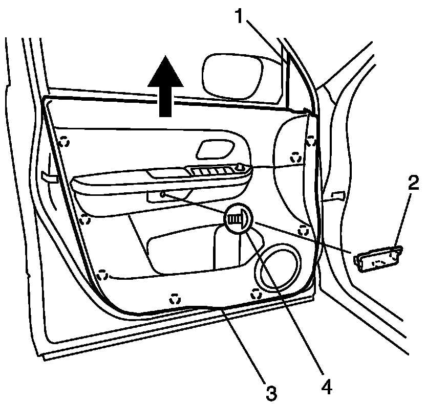 2. Remove door trim (3) after removing door trim screw (4) and clips.