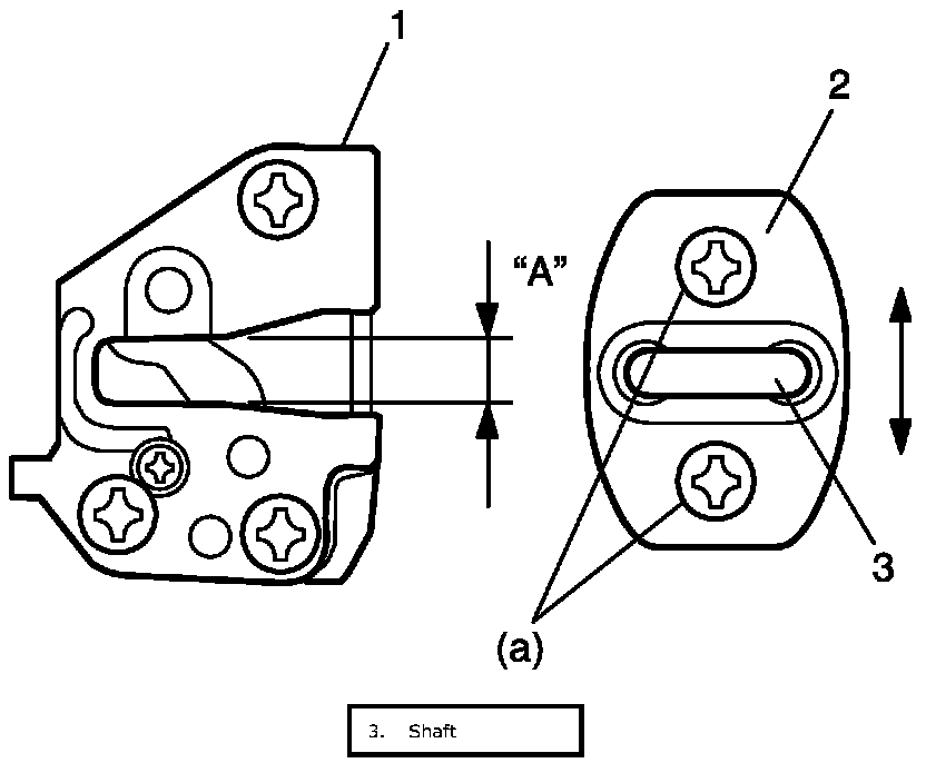 - Move door latch striker (2) up or down so its center aligns with the center of groove "A" on the door lock assembly (1) as shown.