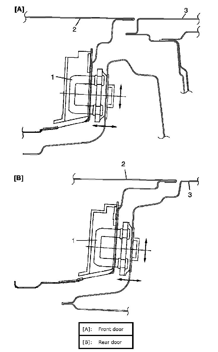 - Move door latch striker (1) sideways to adjust door outer panel surface (2) flush with rear door outer panel or body outer panel surface (3) as shown.