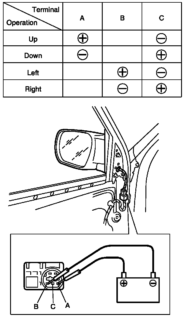 3. Check that door mirror operates properly when battery voltage is applied to connector terminals.