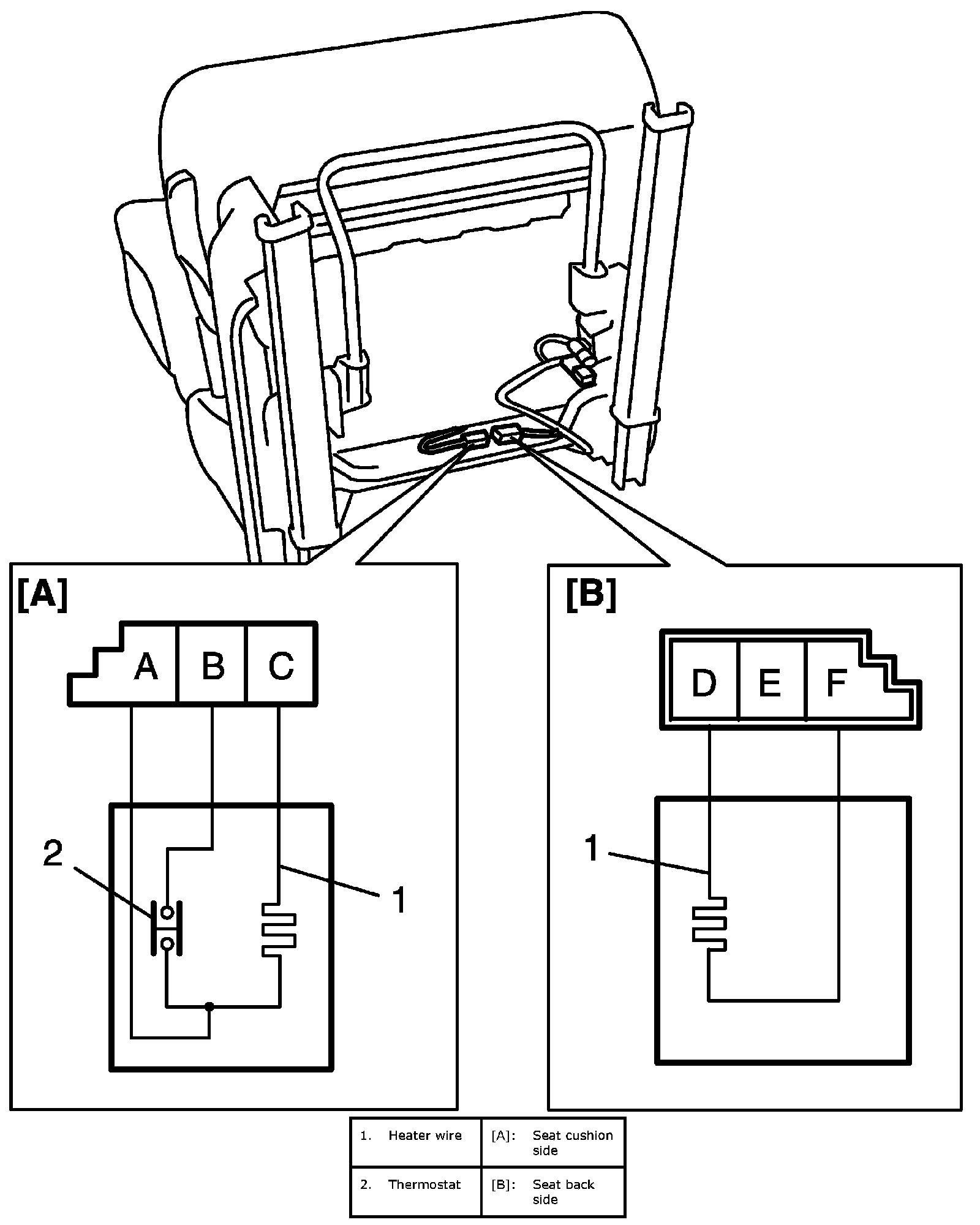 Seat cushion side [A] (between terminal "B" and "C", between terminal "A" and "C"): 4.7-5.7 ohms (at 20 °C, 68 °F)