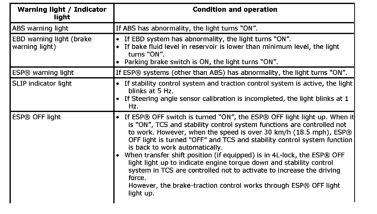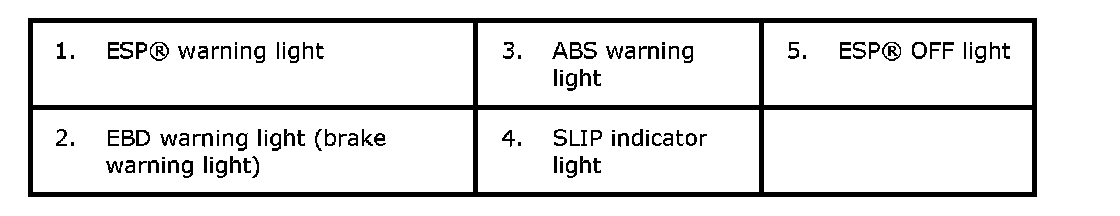 Warning Light, Indicator Light DescriptionThere are five types of warning light and indicator light in instrument cluster, which are controlled by ESP(R) control module. They give warning / indication to driver by changing the modes light ON / blinking / light OFF.