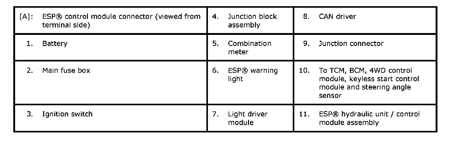 Operation (ON/OFF) of ESP(R) warning light is controlled by ESP(R) control module through light driver module in combination meter.