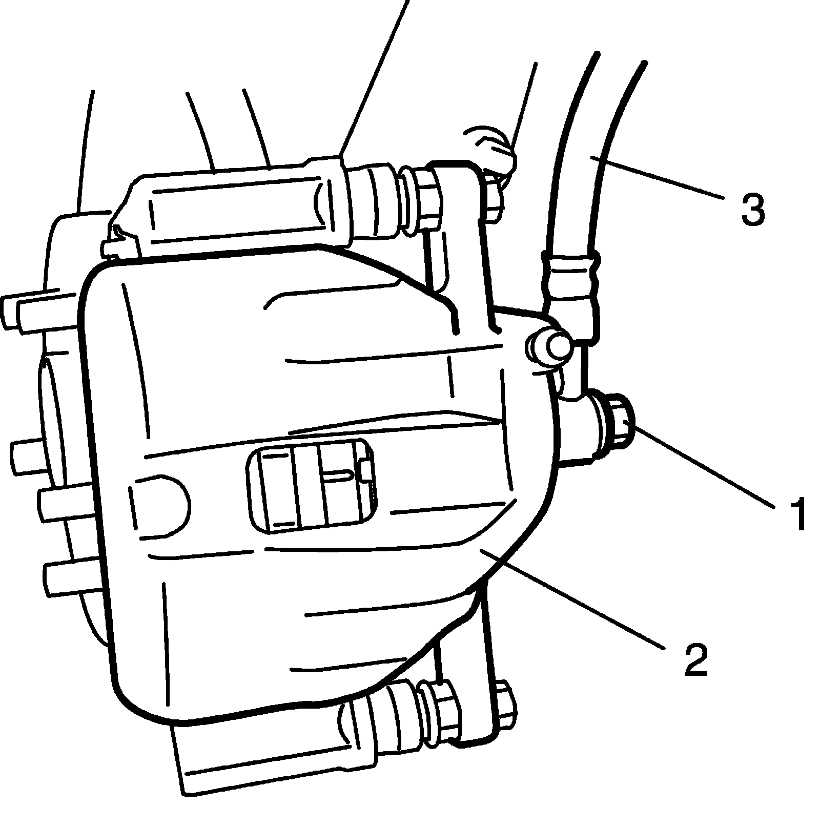 2. Remove brake flexible hose mounting bolt (1) from caliper (2). As this will allow fluid to flow out of hose (3), have a container ready beforehand.
