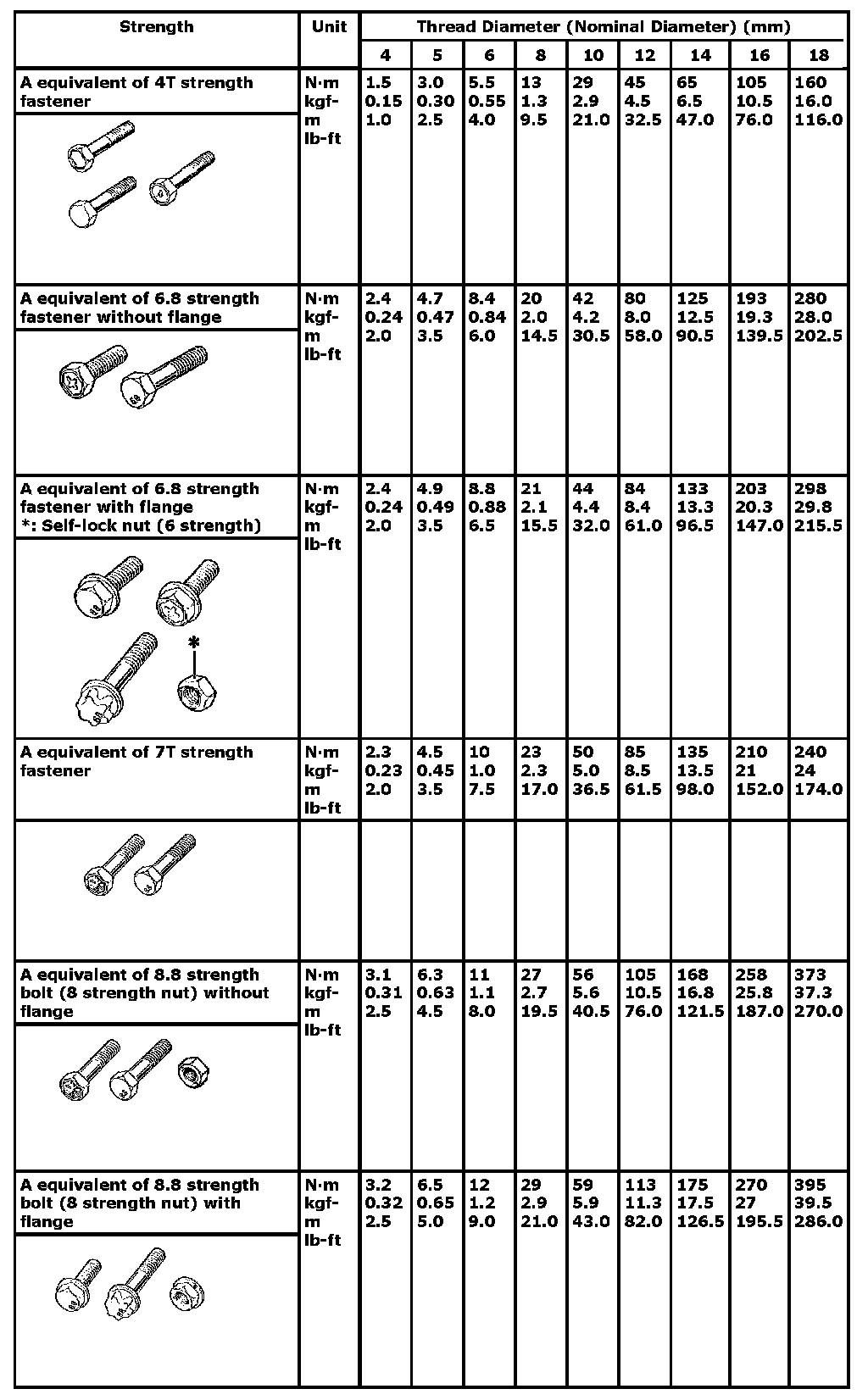 - For the flanged bolt, flanged nut and self-lock nut of 4T and 7T strength, add 10% to the tightening torque given in the following chart.